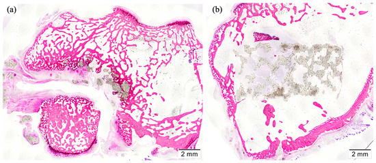 The effect on bone regeneration was evaluated by creating bone-critical defects in a rabbit femoral condyle model. After twelve weeks of implantation, specimens were processed, and two slides were obtained from the central sections of each one. Then, they were stained with Lévai–Lazckó’s protocol and evaluated histologically by optical microscopy. Representative histological images are included in Figure 11.