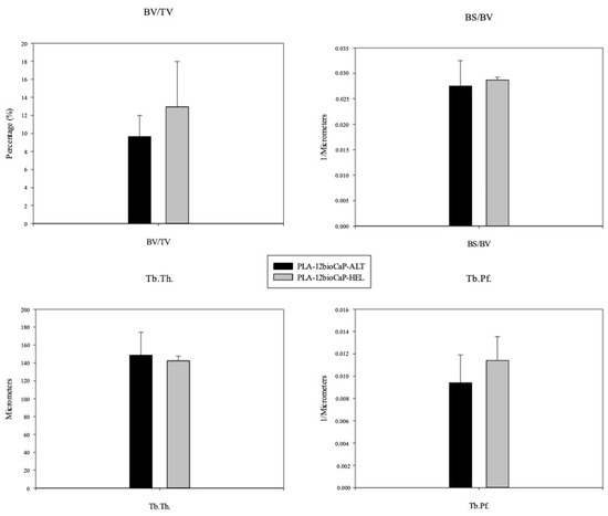 Bone regeneration inside the VOI was evaluated through a micro-tomographic analysis, and values regarding the following histomorphometric parameters were obtained: BV/TV, BS/BV, Tb.Th., and Tb.Pf. Significant differences between alternate and helical structures for any of the analyzed parameters were not found. As shown in Figure 10, the amount of newly formed bone was higher for the helical structure than the alternate structure, with BV/TV percentages of 12.94 ± 5.0% and 9.65 ± 2.3%, respectively, and likewise for BS/BV and Tb.Pf. There were slight variations among structures, indicating that the available bone surface and the intertrabecular connectivity ratio were mildly higher in helical structures. However, regarding trabecular thickness, newly formed bone trabeculae seemed slightly thicker for alternate structures.