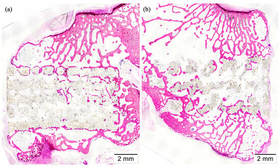 Histological Lévai–Laczkó stained non-colored (a) and colored (b) sections of helical scaffolds implanted in rabbit femoral condyle.