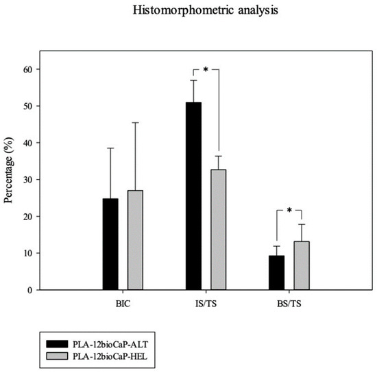 Nevertheless, the biodegradability of the implants should also be considered since a higher available surface for scaffold–environment contact will lead to further degradation, decreasing the IS/TS obtained values. Finally, one of the most important parameters for evaluating the osteogenic potential of the different structures is the Bone Tissue-to-Tissue Surface ratio (BS/TS). Histomorphometric analysis revealed statistically significant differences between the helical and alternate structures when measuring the newly formed bone (BS/TS). The implanted scaffolds with a helical disposition achieved BS/TS mean values of 13.13 ± 4.70%, significantly higher than the ones obtained by the alternate structures (9.246 ± 2.64%). Thus, the characteristics of the helical structures seemed to be more adequate to achieve a more significant osteogenic potential for bone regeneration in critical defects.