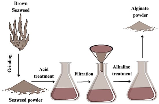 - Saji, S.; Hebden, A.; Goswami, P.; Du, C. A Brief Review on the Development of Alginate Extraction Process and Its Sustainability. Sustainability 2022, 14, 5181. [Google Scholar] [CrossRef]