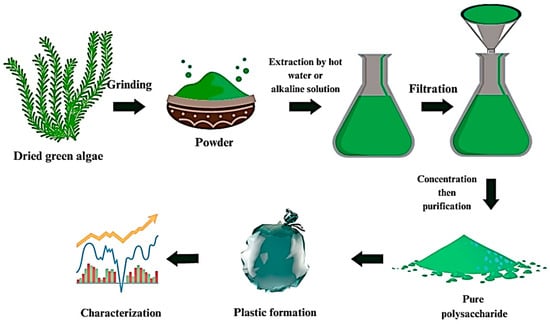 The production of macroalgae bioplastic involves the extraction of polysaccharides from the macroalgae. Alginate and laminarin are extracted from brown macroalgae, while carrageenan and ulvan are extracted from red and green macroalgae, respectively [88,89,120].