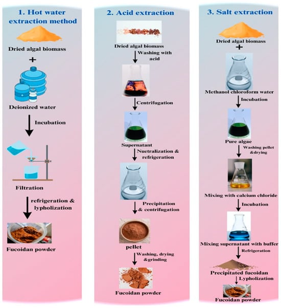 Fucoidan is a polysaccharide found in brown algae whose extraction methods are varied. The hot water extraction method involves dissolving algal biomass in deionized water, followed by incubation with agitation. The next steps are filtration, refrigeration, and lyophilization to form dry powder. The second method of extraction is acid extraction. In this method, dried algal biomass is washed with hydrochloric acid, then the supernatant is centrifuged and neutralized with an alkaline solution such as sodium hydroxide, followed by refrigeration. Ethanol was then added to precipitate fucoidan, which was then collected by centrifugation. The fucoidan pellet is washed using ethanol, dried, and ground to a fine powder. The third method is by using salt extraction. The dried algal biomass is washed with a mixture solution of methanol, chloroform, and water during stirring conditions to separate contaminations. The next step is washing the pellet with acetone and then drying it in a fume hood. The pellet is mixed with CaCl2 to extract fucoidan while incubated in stirring conditions. The supernatant is then mixed with a suitable buffer and refrigerated to precipitate fucoidan [139]. The mixture is centrifuged to collect fucoidan and washed using an ethanolic sodium iodine solution. Finally, lyophilization is used to obtain a water-soluble white powder of fucoidan (Figure 7).