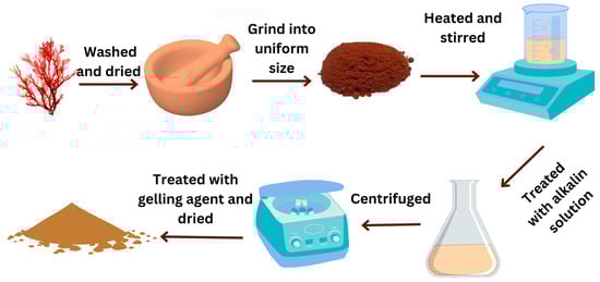 The sun-dried red seaweeds were grounded into small particles or flakes and sieved to achieve uniformity. Carrageenan extraction can be easily performed using the hot water method (hydrolysis). The dried powders were soaked in- hot water (60–90 °C) for 2 h and treated with the alkaline solution at different concentrations to release carrageenan [140]. Carrageenan-rich extract was separated from the solid residue using vacuum filtration or centrifugation techniques. Isopropyl alcohol, or potassium chloride, was added as a gelling agent to precipitate carrageenan [140,141]. The precipitated carrageenan was thoroughly washed to remove impurities and dried under controlled conditions (Figure 8).