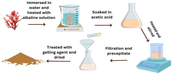 The alkaline extraction method is a commonly used technique for the extraction of agar [142]. The grounded red seaweeds are immersed in water and heated with an alkaline solution like sodium hydroxide followed by acetic acid. This treatment helps in solubilizing agarose, the main component of agar. The mixture is heated and stirred continuously to facilitate extraction. The temperature and duration depend on the specific conditions and type of red algae used. After sufficient extraction, the mixture is filtered to separate the agar solution from the residue. A filter or cheesecloth removes solid particles, obtaining a clear liquid. The extracted agar solution is further treated with a gelling agent or chilled to induce agarose precipitation. Agarose can form a gel-like structure when cooled or with the addition of gelling agents. Common gelling agents include ethanol, isopropanol, or potassium chloride. The precipitated agarose gel is washed with water to remove impurities or traces of gelling agents. Finally, it is dried under controlled conditions to obtain agar flakes or powder (Figure 9).