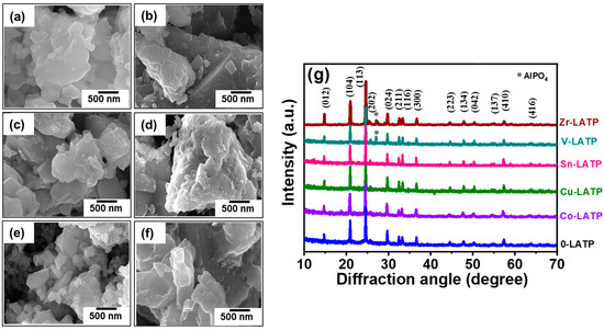 SEM images of (a) 0-LATP, (b) Co-LATP, (c) Cu-LATP, (d) Sn-LATP, (e) V-LATP, and (f) Zr-LATP samples. (g) XRD pattern of various samples synthesized.