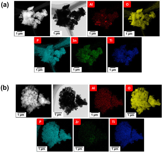TEM micrographs of (a) Sn-LATP and (b) Zr-LATP samples and their corresponding elemental mapping data.