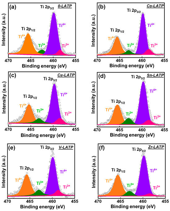 High-resolution XPS Ti 2p spectra of (a) 0-LATP, (b) Co-LATP, (c) Cu-LATP, (d) Sn-LATP, (e) V-LATP, and (f) Zr-LATP samples.