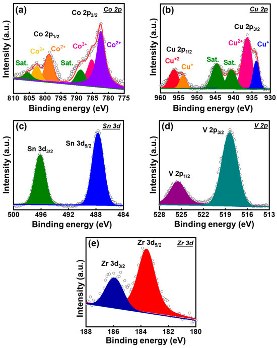 High-resolution XPS (a) Co 2p, (b) Cu 2p, (c) Sn 3d, (d) V 2p, and (e) Zr 3d spectra for Co-LATP, Cu-LATP, Sn-LATP, V-LATP, and Zr-LATP samples, respectively.