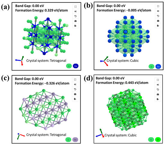 Schemes of bonding structures of (a) Li-Co, (b) Li-Cu, (c) Li-Sn, and (d) Li-Zr systems and their corresponding formation energies.