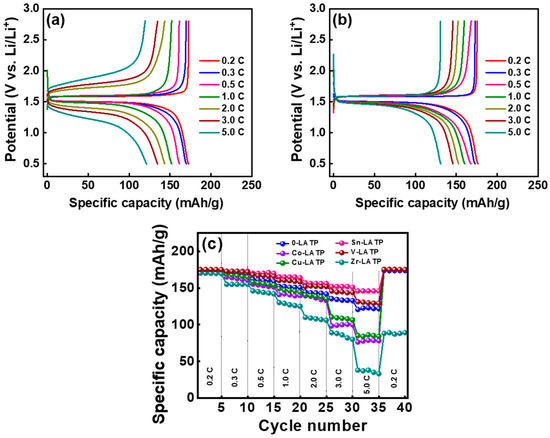 The charge–discharge profiles of the LTO half cells equipped with the CSEs containing 0-LATP and Sn-LATP are shown in Figure 7a,b, respectively. The charging and discharging tests were carried out within a voltage range of 0.5 to 2.8 V (vs. Li/Li+) at different rates ranging from 0.2 to 5 C. At 0.2 C, the cells exhibit distinct voltage plateaus, signifying a two-phase reversible reaction at approximately 1.5 V vs. Li/Li+. The intercalation/de-intercalation process can be expressed as [7] Li3[LiTi54+]O12 + 3 e− + 3 Li+ ↔ Li6[LiTi33+Ti24+]O12. During the electrode lithiation process, the Li ions insert into the octahedral (16c) sites of Li4Ti5O12 lattices, forming a rock-salt structure [8]. Theoretically, a typical LTO electrode offers a reversible capacity of 175 mAh g−1, based on the Li+ insertion/de-insertion process mentioned above. Figure 7c compares the rate capability of various cells across the range of 0.2–5 C. As evident from the plot, all of the LTO electrodes exhibit high specific capacities of ~170 mAh g−1 at 0.2 C, very close to the theoretical value. At a high rate of 5 C, the cells with CSEs containing 0-LATP, Co-LATP, Cu-LATP, Sn-LATP, V-LATP, and Zr-LATP fillers showed reversible capacities of 120, 76, 85, 146, 131, and 38 mAh g−1, respectively, corresponding to 70%, 44%, 49%, 86%, 77%, and 23% capacity retention compared to the values measured at 0.2 C. When the current rate decreased back to 0.2 C, the capacities were restored, as shown in Figure 7c. The cells equipped with the CSEs containing Sn-LATP and V-LATP demonstrated superior rate capability owing to the relatively low ESR and high Li+ conductivity of the electrolyte layers. This promising outcome (i.e., high electrode performance at high rate) underscores that the LTO-supported CSEs have paved the way for realizing a high-power SSLB.