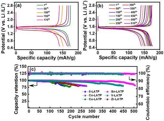 Figure 8a,b compare the charge–discharge curves of the LTO cells equipped with the CSEs containing 0-LATP and Sn-LATP fillers, respectively. The objective of this experiment was to assess the electrochemical stability of the cells through galvanostatic cycling at ambient temperature. An observable plateau at ~1.5 V and stable discharge performance upon cycling for the Sn-LATP cell reflect the robustness of the CSE layer. In addition, the high reversibility of Li+ intercalation and de-intercalation into/from the spinel LTO structure was confirmed. Figure 8c shows the capacity retention and Coulombic efficiency as a function of cycle number for various LTO-supported CSE cells. These metrics serve as indicators to assess the cycling stability of the cells. The cycling tests continued until the capacity retention fell below 80%. Notably, all of the cells demonstrated acceptable durability, maintaining over 80% capacity after at least 170 cycles. The comparative analysis indicates that the cell durability ranks as follows: Sn-LATP (510 cycles) > V-LATP (450 cycles) > Co-LATP (275 cycles) > Zr-LATP (240 cycles) > Cu-LATP (200 cycles) > 0-LATP (170 cycles). Compared to other dopants, the ionic radius of Sn4+ (0.69 Å) is closer to that of Ti4+ (0.605 Å). Therefore, the crystal structure does not experience excessive lattice distortion [59]. Furthermore, Sn4+ with higher Pauling electronegativity (1.96) can improve the stability of the NASICON framework [42,59]. Consequently, the cell equipped with the Sn-LATP CSE demonstrated optimal performance and maintained high Coulombic efficiency (>99.0%) over 510 cycles. These data also reveal the potential of these CSEs for improved electrochemical stability against Li metal electrodes (since Li metal foil was used as the counter electrodes for the LTO-supported CSE cells). After cell testing, no cation reduction reaction is observed. This phenomenon is likely attributed to the presence of the polymer phase in the CSE. The polymer phase plays a crucial role in the system to encapsulate the LATP particles, thus forming a protective barrier that isolates the LATP particles from direct contact with the lithium metal. The ceramic fillers enhance the mechanical strength of the CSEs, acting as the capping layers to suppress Li dendrite formation. Sn doping in LATP has been confirmed as an agreeable strategy to improve the CSE performance, which is highly compatible with both Li metal and LTO electrodes, enabling superior rate capability and desirable cycling stability of the solid-state cell.