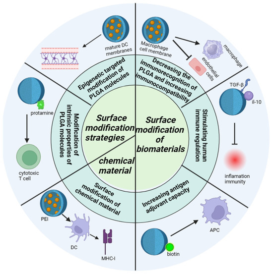 Further modifications could increase its immunomodulatory function. By modifying APCs mimic molecules on the surface of PLGA particles, the function of APCs could be mimicked, activating and regulating the activity of immune cells. These modified molecules could include MHC molecules, costimulatory molecules, and inflammation regulators [47].