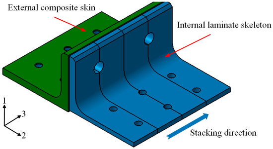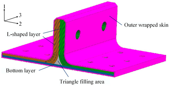 As illustrated in Figure 2, the polymer composite bolted T-joint with conventional configuration (hereafter abbreviated as conventional T-joint) consists of two L-shaped layers, a bottom layer, a triangle filling area and outer wrapped skin, where L-shaped layers and base panel layers are composite laminates, and the triangle filling area mainly consists of resin matrix, short fibers, or twisted fibers [6]. When transverse bending loads are transmitted to the corner area of the T-joint, due to the significantly lower interlaminar mechanical properties of composite materials compared to that is in-plane [7], the conventional T-joint may experience failure modes such as bonding interface failure, laminate delamination, and random crack propagation within the triangle filling area [8]. In order to improve the load-carrying capacity of the conventional T-joint, some researchers have adopted methods such as stitching [9,10,11,12], Z-pin [13,14,15], and triangle filling area reinforcement [1,16,17] to delay the failure in interlaminar and triangle filling areas. Moderate stitching and Z-pins can effectively delay and reduce delamination damage to the joint and improve its load-carrying capacity [18], but they may also weaken the in-plane mechanical properties of laminates [19,20,21]. Moreover, the filling material in the triangle area is still connected to the L-shaped layer through the resin matrix, and the triangle filling area remains a weak position for bearing load, thus the degree of improvement in the mechanical performances of joints by this method is limited [17]. It can be seen that conventional T-joints have always struggled to address the problem of interlaminar load transfer in the corner area, severely limiting the application potential of composite T-joints.