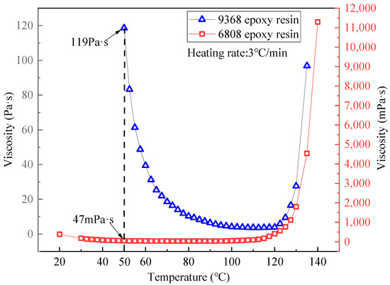 Viscosity–temperature curve of 9368 epoxy resin and 6808 epoxy resin.