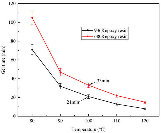 Gelation time curves of 9368 epoxy resin and 6808 epoxy resin.