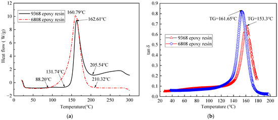 DSC curves (a) and DMA curves (b) of 9368 epoxy resin and 6808 epoxy resin.