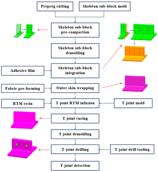 According to the prepreg-RTM co-curing process depicted in Figure 10, the specific preparation procedure for the novel T-joint is illustrated in Figure 13, encompassing the following steps: (1) Using an automatic cutting machine, ZT7G/9368 prepreg layers are cut to predetermined geometric dimensions and laid up in the [0/+45/90/−45]ns sequence into preforms of sub-blocks, where the 0° direction corresponds to direction 1 in Figure 3, and the 90° direction corresponds to direction 2 in Figure 3. Then, the sub-blocks are pre-compacted and molded using a compression molding method at 90 °C, with a dwell time of 30 min, followed by natural cooling under pressure to room temperature before demolding for subsequent use. (2) Four sub-blocks are bonded together using 9368 resin adhesive film to form the integral structure of skeleton. (3) As per the design requirements of stacking sequence of skin, skeleton was wrapped with ZT7G wrap-knitting fabric and ZT7G/G0814 plain weave fabric. (4) T-joint preforms are placed into the RTM co-curing mold, and after completing the sealing inspection, RTM resin injection is carried out at 50 °C, with injection pressure of 0.6 MPa at the inlet and −0.1 MPa vacuum pressure at the outlet. Then, the injection completion is confirmed by observing resin flow at the outlet. (5) After injection, the mold is placed in the oven and ramped up to 90 °C at a rate of 3 °C/min, held for 30 min, then further ramped up to 130 °C at the same rate and held for 120 min. (6) The mold is naturally cooled to room temperature before demolding, followed by hole drilling on the T-joint. (7) Non-destructive testing is conducted on the prepared novel polymer composite bolted T-joint to ensure quality assurance.