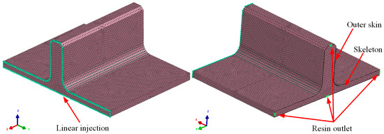 In the RTM process, the curing time can account for up to 80% of the entire RTM process, and excessively long resin injection time can also increase the viscosity of the RTM resin [35]. Therefore, it is necessary to analyze the flowability of the RTM resin during the prepreg-RTM co-curing process. Based on the structural form of the novel T-joint, a design scheme with straight injection channels is adopted to simplify the mold structure and ensure overall sealing, with a linear injection inlet and four resin outlet points designed at both ends of the T-joint. The injection pressure is set to 0.6 MPa positive pressure at the inlet and −0.1 MPa vacuum negative pressure at the outlet. A simulation model was established using PAM-RTM 2019 commercial software to analyze the RTM resin injection process, as depicted in Figure 11. The mesh was generated using four-node tetrahedral elements, resulting in a total of 321,300 elements. The thickness of the outer skin dry fabric was 1 mm, with a fiber density set at 1.6 g/cm3, while the fiber volume fraction of internal skeleton was 60.9%, with a density of 1.55 g/cm3. The resin viscosity was 100 mPa·s, with a density of 1.2 g/cm3 and the permeability in the X, Y, and Z directions was set to 2 × 10−13 m2, where the X, Y, and Z directions correspond to direction 3, direction 2, and direction 1 in Figure 2, respectively.