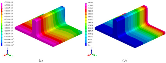 The results of the RTM resin flow analysis, as shown in Figure 12, indicate that the distribution of saturated permeation pressure confirms the absence of dry spots during the injection process. Additionally, the mold filling time for injection is 6529.6 s, satisfying the process stability requirements of 6808 resin which can maintain a viscosity of no more than 100 mPa·s for up to 5 h at the injection temperature of 50 °C. Hence, this RTM resin injection scheme is suitable for the fabrication process of the novel T-joint proposed in this study.