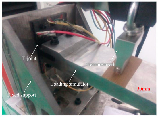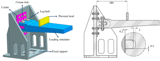 The loading scheme and test setup are depicted in Figure 14 and Figure 15, respectively. The test fixture system comprises the wing loading simulator, pressure head, and fuselage simulation fixture (fixed support) used for loading and securing the T-joint, while according to the actual usage conditions of the joints, connecting fasteners were designed to form the test loading fixtures for the T-joint. The fixed support is fabricated from Q345 steel through welding and machining processes, with its bottom connected to the Instron 8801 testing machine. The wing loading simulator and pressure head are made of 45# steel. The connecting fasteners between the T-joint and the fixed support consist of 12 M6 high-strength steel bolts, while those between the T-joint and the wing loading simulator consist of 2 M10 high-strength steel bolts, which apply loads to the T-joint through the pressure head. According to an actual service condition of the T-joint in a certain engineering project, the length of the loading arm between the pressure head and the bottom of the T-joint base panel is set to 180 mm. Additionally, to avoid interference assembly between the lug of the T-joint and the wing loading simulator, assembly clearances of 0.1 mm and 0.2 mm are, respectively, provided between the lug and the simulator assembly surface, as well as between the two fastening bolts and the mating surface of the T-joint. The loading speed of the pressure head is set to 0.5 mm/min. During the test, displacement and load data are recorded by the testing machine. Furthermore, to compare the strain distribution at critical locations between the novel T-joint and conventional T-joint, strain tests were conducted on T-joints N2 and C1, with the arrangement of strain gauges illustrated in Figure 16.