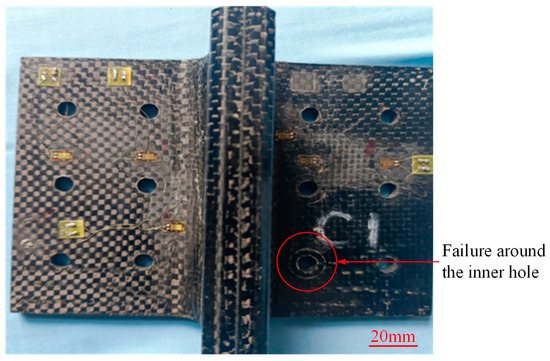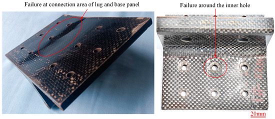 The visualized typical failure modes of specimen N1~N6 after bending tests are depicted in Figure 18. All the novel T-joints exhibit bending fracture failures near the connection area of lug and base panel, with significant residual deformations and surface bulging observed, indicating the occurrence of delamination cracks between skin and skeleton. Additionally, noticeable compression failures are observed near the inner holes of the base panel, while there is almost no damage near the outer holes, suggesting that the inner holes bear greater loads, resulting in higher compression stress in this area and more significant damages. The visualized typical failure modes of the conventional T-joints are shown in Figure 19. Apart from slight compression traces around the inner holes, there are hardly any other visible damage modes observed.