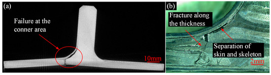 After curing, the internal quality of the novel T-joint was tested using optical imaging, as shown in Figure 17. The optical image indicates that the internal skeleton is well bonded with external skin, showing no visible delamination cracks or large-scale dense pores. However, there are still some small-sized void defects, primarily located near the junction between the prepreg layup and the RTM fabric layup. The possible cause of these defects lies in the inadequate precision of cutting the laminate prepreg during the layup process. In summary, it is evident that the novel T-joint utilizing 9368 resin and 6808 resin systems exhibits good interface quality between internal skeleton and external skin.