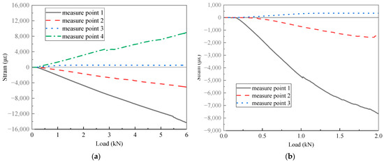 The strain–load curves of specimens N2 and C1 are depicted in Figure 22, with the load of specimen N2 intercepted up to the damage initiation load of 6 kN, while the load of specimen C1 is intercepted up to a load of 2 kN in the linear segment of the load–displacement curve. It can be observed that the farther the strain gauge is from lug, the smaller the measured strain, confirming the viewpoint mentioned earlier that inner holes bear greater loads. Moreover, the strain of the novel T-joint exhibits higher linearity before the damage initiation load, indicating that significant internal damage has not occurred. Conversely, the conventional T-joint exhibits good linearity in the curve before 1 kN, but after 1 kN, it shows significant nonlinearity, indicating significant damage occurring within the joint near 1 kN. This also suggests that the novel T-joint possesses superior load-carrying capacity.