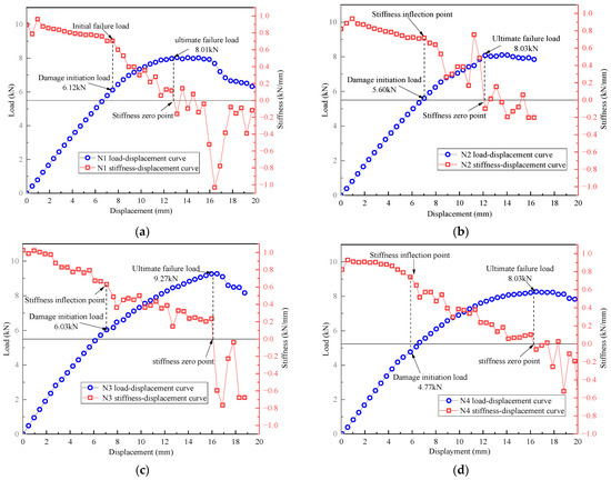 On the other hand, the load–displacement curves of the T-joints obtained from the tests, and the bending stiffness–displacement curves obtained by differentiating the bending load and displacement, are shown in Figure 23. It can be observed that the variation of bending stiffness of the novel T-joint can be roughly divided into three stages. In the initial stage, the bending stiffness of the novel T-joint remains relatively stable, with the bending load and displacement exhibiting good linearity. When load increases to about 6 kN, a turning point in bending stiffness occurs, with a noticeable decrease in the slope of the load–displacement curve, and the rate of increase in the load gradually decreases. When displacement is around 8 mm, the bending stiffness decreases to below 0.7 kN/mm. With further increase in load, the slope of load–displacement curve continues to decrease until reaching the ultimate load, with the ultimate load of ranging from 8.01 to 9.27 kN. With further increase in displacement, bending stiffness becomes negative, indicating loss of load-carrying capacity by the novel T-joint.