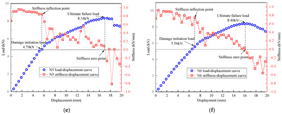 Load–displacement curves and stiffness–displacement curves of N1 (a), N2 (b), N3 (c), N4 (d), N5 (e), and N6 (f).