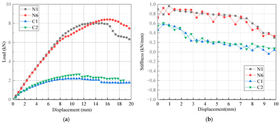 Load–displacement curves (a) and stiffness–displacement curves (b) of specimens N1, N6, C1, and C2.