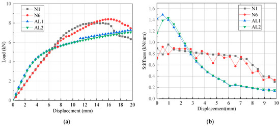Load–displacement curves (a) and stiffness–displacement curves (b) of specimens N1, N6, AL1, and AL2.