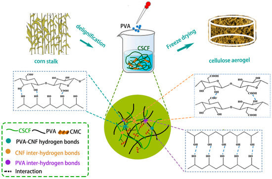Schematic diagram of the synthesis of CSCFS/PVA aerogels and potential crosslinking interactions in aerogel networks.