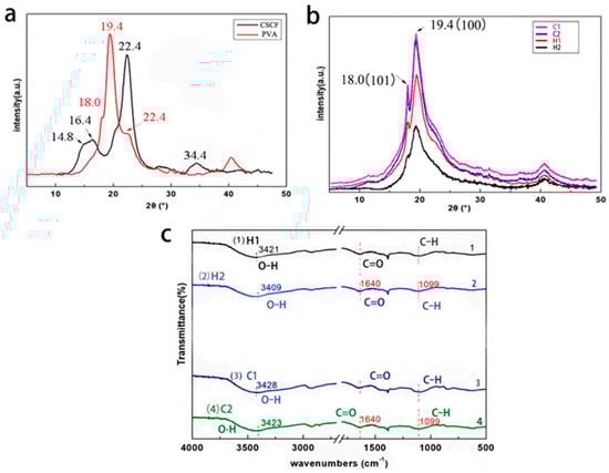 XRD patterns and FTIR of CSCFS, PVA, and aerogel samples. (a) XRD patterns of pure CSCFS and PVA. (b) XRD patterns of aerogels with different components (y = H1, H2, C1, C2). (c) FTIR spectrum of aerogels with increased CSCFS (lines 1 and 2) and PVA contents (lines 3 and 4).