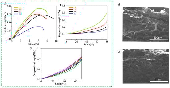 Strain–stress curves of four aerogels. (a) Tensile strength of the aerogel at various concentrations; (b) compressive strength of aerogels; (c) strain–stress of C1 under loading–unloading cycles. SEM images of aerogel (d) before and (e) after compression.