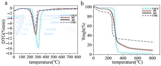 Thermogravimetric analysis of CSCFS, CMC, and aerogels was performed, as shown in Figure 5. Compared to pure CMC, CSCFS has a higher initial thermal decomposition temperature (Tonser), and the main derivative thermal degradation (DTG) peak is located at a higher temperature. The decrease in CMC’s thermal stability is attributed to the carboxylic acid portion, which has been reported elsewhere []. At 257 °C, the DTG peaks of different foams were passivated, while the DTG peaks of C1 and C2 shifted to the high-temperature region (Figure 5a). Compared to CMC, the thermal stability of C1 and C2 aerogels was significantly improved (about 54.9°) due to CSCFS’s high thermal stability. However, the experimental values of Tonser and Tp are higher than the theoretical values, which may be because the cellulose content of C1 and C2 is higher than that of CMC (Figure 5b). The CSCFS/PVA gel material has excellent thermal stability, comparable to most existing cellulose-based and CMC-based materials []. These results indicate that the improved thermal stability cannot be solely attributed to cellulose’s high thermal stability, but rather to the possible existence of specific interactions between CSCFS/CMC and PVA.