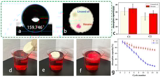 Reusability of CSCFS/PVA aerogels for n-hexane. (a) The water contact angle of CSCFS/PVA aerogel; (b) absorption of n-hexane (red) and linseed oil (colorless); (c) absorption capacity of aerogels to hexane and linseed oil; (d) recovered CSCFS/PVA aerogels; (e,f) The absorption behavior of CMC/CSCFS/PVA aerogels; (g) the absorption capacity percentage of CMC/CSCFS/PVA aerogels during 15 cycles.