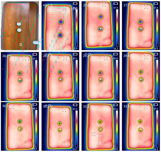 In our daily lives and buildings, most work using thermal insulation materials is carried out at relatively low temperatures (below 45 °C). To study the heat absorption properties of PVA/CNF aerogels, we placed PVA/CNF aerogels in a heating device (250 W) for experiments. Figure 7 shows the thermal images of the original C1 and C2 aerogels before microwave exposure. After the sample was exposed to a thermal radiation pad for 8 s, the two aerogels remained at about 27 °C due to aerogels’ high porosity. The infrared thermal images of the two aerogels were recorded every 10 s (see Figure 7). According to Newton’s law of cooling, the heat loss rate of the system is determined by the following equation: