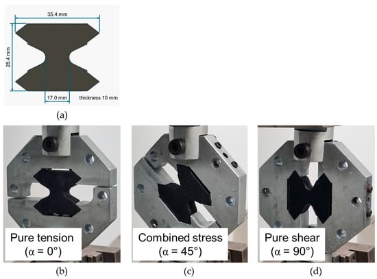 Mechanical tests under different loading modes were performed using a modified Arcan device [35,39]. Trapezoidal samples were printed with gauge section dimensions of 17 mm width and 10 mm thickness. The schematic drawing of the test specimen is presented in Figure 1a. Arcan tests were conducted on an Instron 3369 universal mechanical testing machine (Norwood, MA, USA), with a load cell of 50 kN, and a displacement rate of 2 mm/min. Tests were performed at angles of 0° (pure tension), 45° (combined stress), and 90° (pure shear). Figure 1 shows the assembled Arcan device and the mechanical test modes.