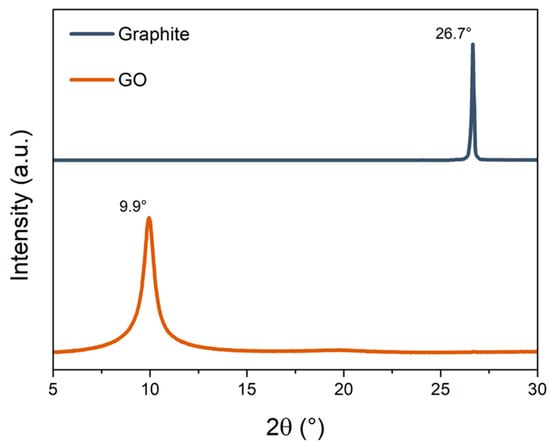 The XRD pattern of pristine graphite and GO is presented in Figure 2. Graphite exhibits a typical peak of the (002) plane at 2θ = 26.7°, corresponding to an interplanar distance (d) of approximately 3.43 Å according to Bragg’s Law [41]. Meanwhile, the (002) plane of GO has shifted to 2θ = 9.9°, resulting in a larger interplanar distance (d ≈ 8.96 Å) when compared to graphite. This occurs due to the insertion of oxygen functional groups into the interlayer galleries of GO [42].