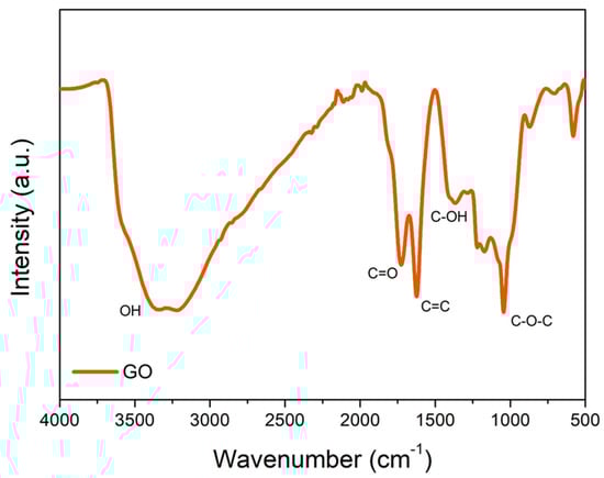 The FTIR spectrum of GO (Figure 3) indicates the presence of characteristic groups of the nanomaterial. Typical intensity peaks of GO are present at 1724 cm−1, associated with the stretching vibration of the C=O bond, 1622 cm−1 from the C=C bond present in the aromatic ring, 1367 cm−1 from the stretching of C-OH, and the peak region at 1041 cm−1 associated with the epoxide C-O-C. The broad band, between 3000 and 3500 cm−1, is associated with hydroxyl group stretching vibrations [42,43,44]. This result, together with observations from XRD, demonstrates the successful synthesis of GO used in this work.