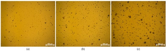 Micrographs obtained from an optical microscope are an important technique that allows for the rapid analysis of dispersed phases in polymers [45,46]. Figure 4 presents the micrographs obtained for samples with different concentrations of GO in the resin. As expected, the acrylic resin exhibits a significant interaction with the functional groups of GO [3,14], resulting in a relatively uniform dispersion of GO particles, particularly at lower concentrations of GO. The 0.2 GO sample (Figure 4a) shows well-distributed GO with the formation of small aggregates, with an average size of 11.38 ± 1.38 μm. In contrast, sample 0.5 GO (Figure 4b) exhibits a higher number of aggregates with a larger average size of 14.3 ± 2.12 μm. At the higher concentration of GO (1.0 GO—Figure 4c), even larger aggregates are formed, reaching sizes on the order of 160 μm and an average size of 21.14 ± 3.28 μm. The formation of aggregates at higher concentrations of nanomaterials is consistent with previous findings in the literature [3,14,22], suggesting that higher concentrations of GO promote stronger interactions between the nanomaterials through van der Waals forces and π-π bonding [47].
