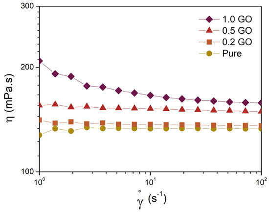 Viscosity is a crucial factor for the efficiency of UV curing, with an optimal viscosity range typically falling between 200 and 1000 mPa·s [17]. If the viscosity is too high, it takes longer for the resin to flow and fill the volume corresponding to the cured layer. This extended time can exceed the exposure time of the next layer, leading to voids and defects that compromise the printed parts’ finish and their mechanical properties. Figure 5 illustrates the viscosity curves of the resin at different concentrations of GO, demonstrating a rise in viscosity as the concentration of GO increases, reflecting the strong interaction between the resin and the functional groups of GO [14]. Nevertheless, the viscosity values are within the ideal range for application. Specifically, at a shear rate of 1 s−1, the viscosity of the pure resin measures 127 mPa·s, while that of the sample containing 1.0 wt.% GO is 208 mPa·s. Furthermore, the pure resin, as well as the samples containing 0.2 and 0.5 wt.% of GO, exhibit Newtonian behavior across the entire range of shear rates. In contrast, the sample containing 1 wt.% of GO displays non-Newtonian rheological behavior at low shear rates, likely due to the presence of larger GO aggregates [47], as observed in the optical microscopy images (Figure 4).