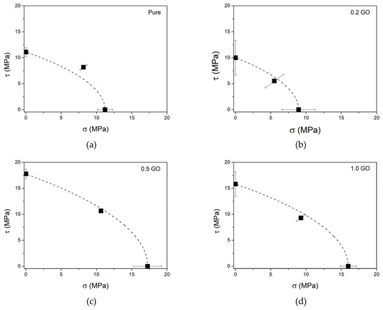 Based on the experimental data, a failure envelope was obtained to predict the failure of GO-based nanocomposites, based on the Drucker–Prager theoretical model. The Drucker–Prager model was initially developed for geomaterials based on elastoplasticity, considering deviatoric and hydrostatic stress components [34]. In recent years, the model has been satisfactorily applied in predicting the failure criterion of polymer materials, including composites, adhesives, and adhesive joints [34,36,39,40].