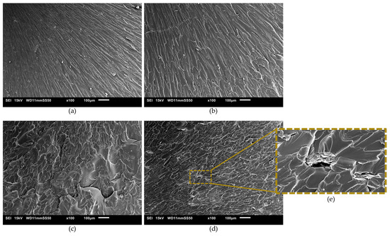 The fracture surfaces of the pure tension tests were coated with a thin layer of gold (15 nm) and evaluated by scanning electron microscopy (SEM), using Jeol JSM-6010LA equipment (Akishima, Japan) with an acceleration energy of 15 kV.