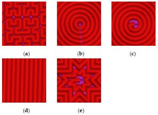 Five types of model patterns used in 3D printing of samples from filament PLA: (a) 1_Hilbert; (b) 2_Concentric; (c) 3_Archimedean; (d) 4_Rectilinear; (e) 5_Octagram.