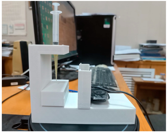 The wettability of the surfaces of flat printed samples with various 3D printing patterns was studied using the original installation for measuring the edge angles of wetting (Figure 2), which we manufactured with a 3D printer. The installation is a stand with a sample holder on which a flat sample is placed. A drop gauge is installed on top, which creates droplets on the surfaces of the samples to measure the wetting edge angle. A webcam is installed opposite the stand with the sample under study, which displays an image of a drop on the screen, and using the PicPick graphic editor program, the wetting edge angle φ of the sample is measured.