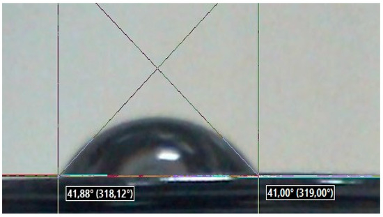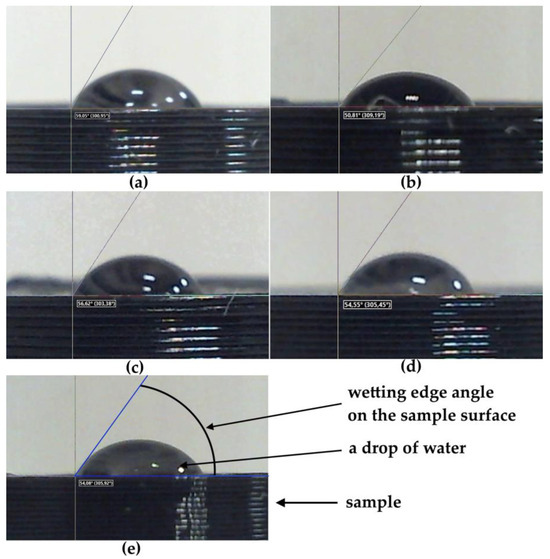 The wettability of the sample surface is a manifestation of the intermolecular interaction at the interface of three phases—solid, liquid, and gas—expressed in the spreading of liquid on the surface of a solid. Since the measurement of the wetting edge angle of the surface is carried out only on flat samples, this section presents the results of a wettability study for only five printed samples. Figure 7 shows images of droplets on the screen of the installation while measuring the wetting edge angle on the surfaces of five samples with different 3D printing patterns made of PLA polymer.