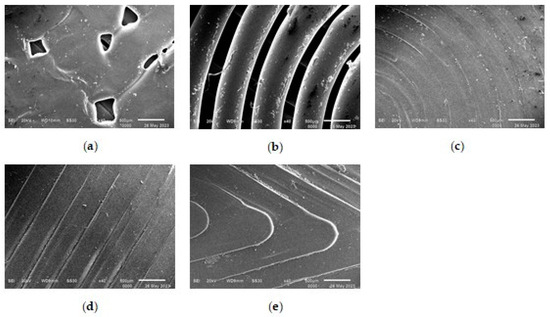 A comparative analysis of the values of the wetting edge angles for the surfaces of samples with different model patterns shows that the wetting edge angles of all printed samples vary within φ = 50°–60°. The large deviation of the average wetting angle values for all samples with respect to the right angle of 90° shows that the surfaces of all five printed samples with different patterns are wettable, i.e., hydrophilic. At the same time, three samples with figures 3_Archimedean, 4_Rectilinear, and 5_Octagram, whose surface micrographs in Figure 4 represent the geometry of their model drawings more or less adequately, have almost equal values of the wetting edge angles φ ≈ 55°. The sample with the least-pronounced 1_Hilbert pattern on a smoother surface with individual defects shows the highest value of the wetting angle φ = 59°; i.e., it is less hydrophilic as compared to the other samples. The 1_Hilbert model pattern has the most complex geometry, which the extruder cannot implement in a continuously layered way. Therefore, when printing a sample with such a pattern, there is a statistically noticeable destruction of the polar bonds of PLA and the resulting decrease in hydrophilicity.