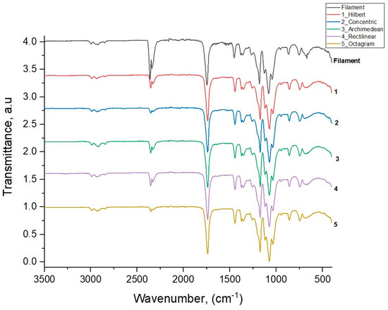 Figure 6 shows the IR transmission spectra for the initial filament PLA and five 3D-printed samples with various model patterns obtained through the method of attenuated total internal reflection [20,21] with the IR spectrometer Brucker Vertex 70.